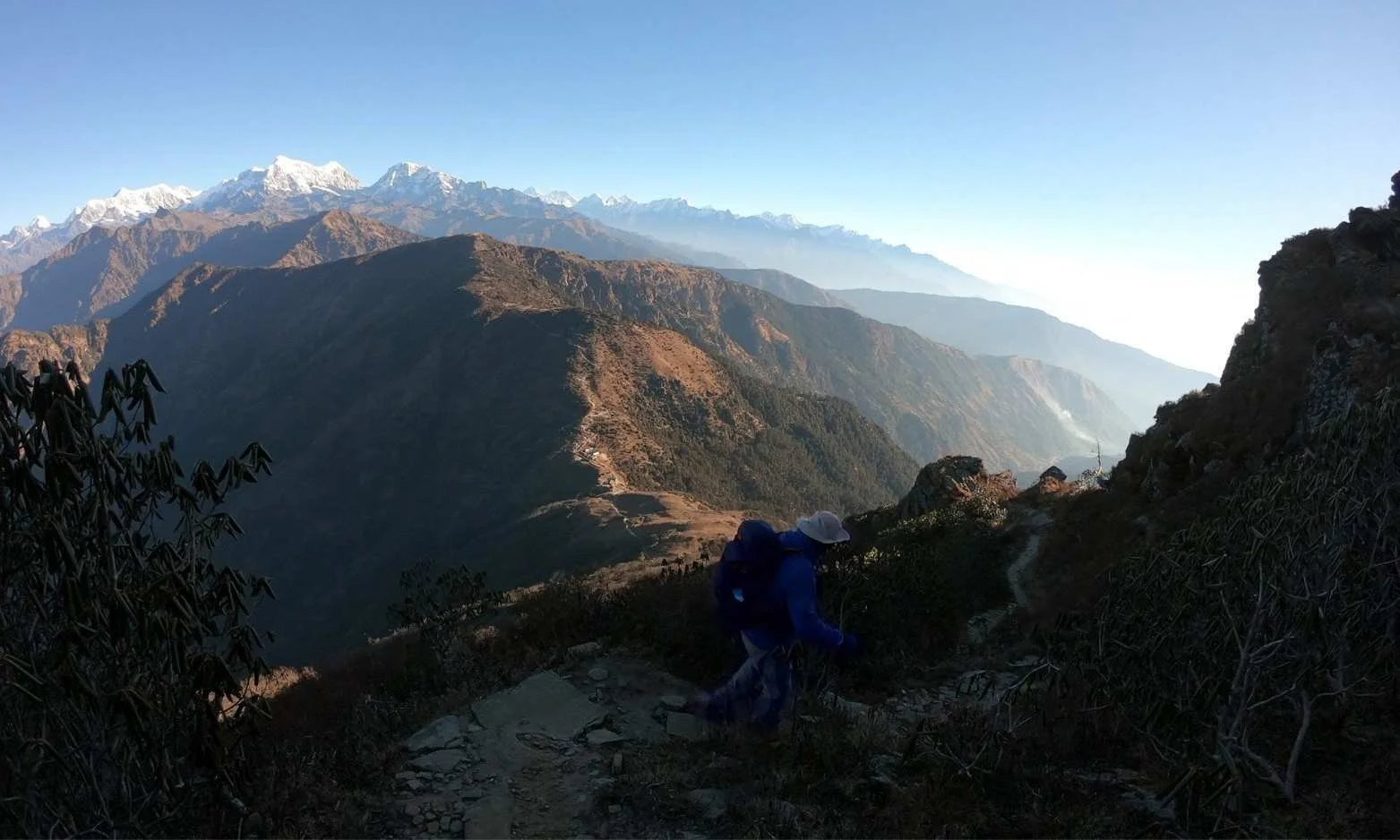 We rise early for the trek's pinnacle. First, we climb Pikey Peak, anticipating a spectacular sunrise. Clear skies offer rare views of the Himalayas. Meanwhile, our porter carries a thermos of hot tea, providing warmth in the crisp pre-dawn air. Following nature's display, we descend back for a hearty breakfast before continuing to Jasmane Bhanyang.